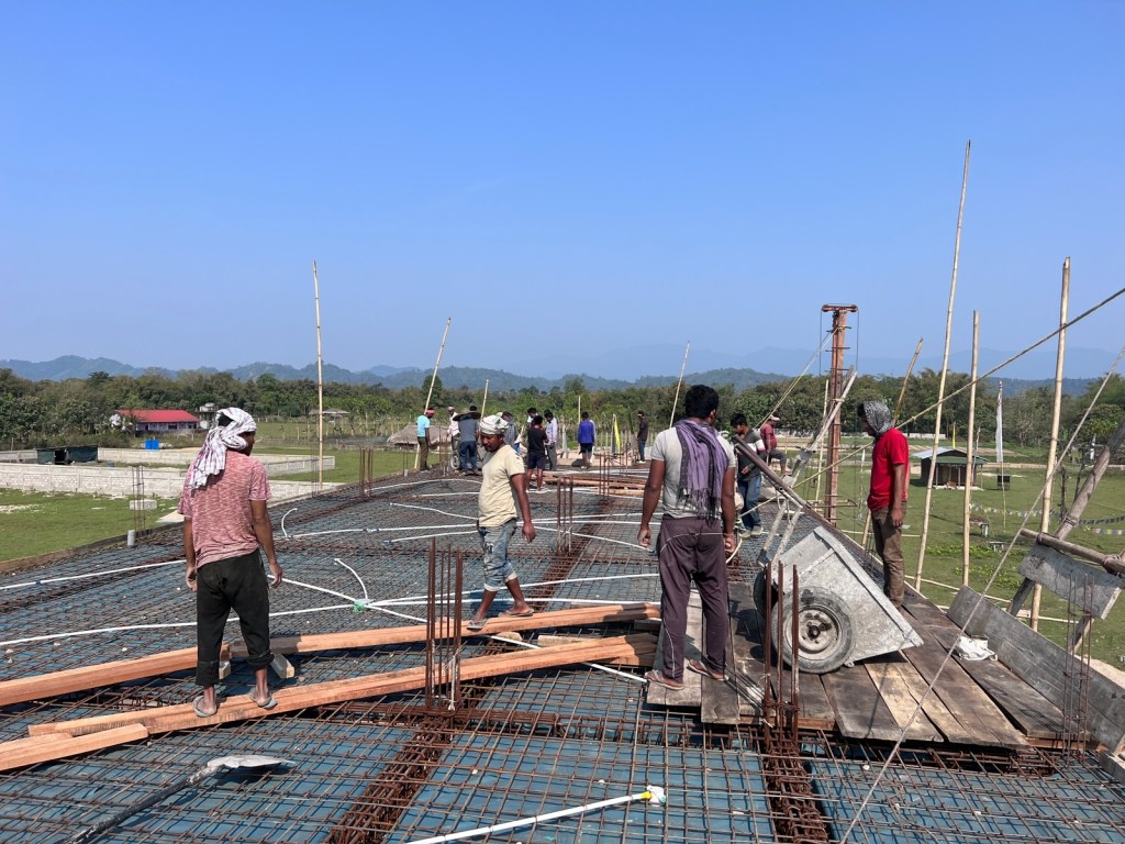 Local volunteers and workers are pouring concrete on the roof of the Odiyana School for disadvantaged children